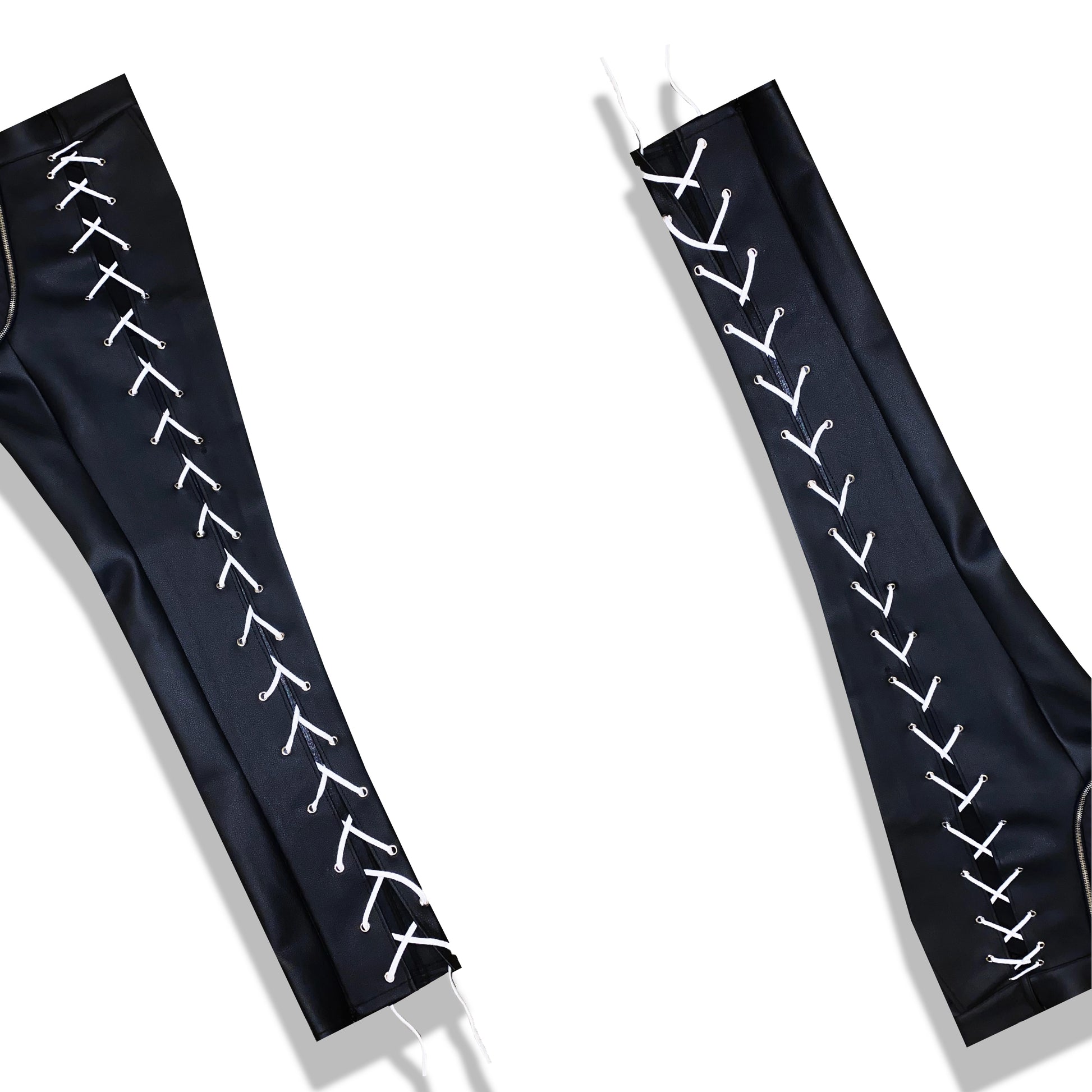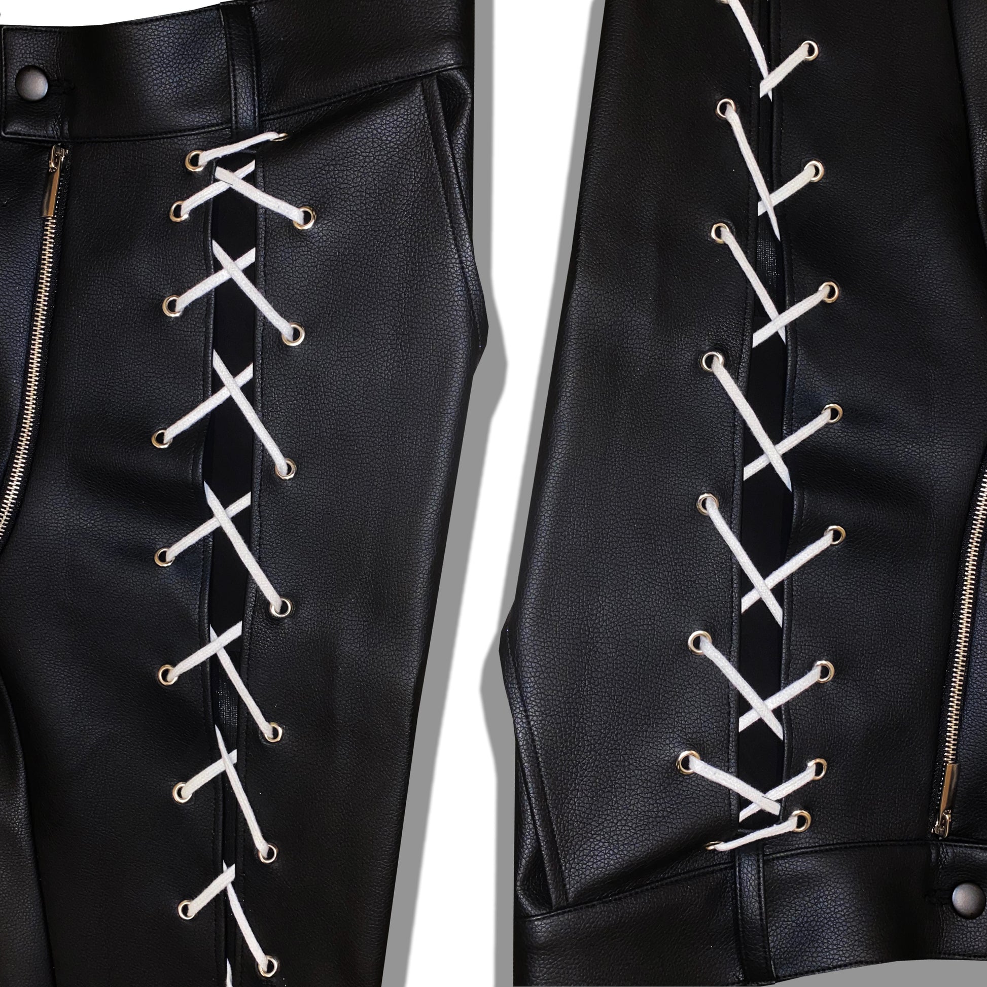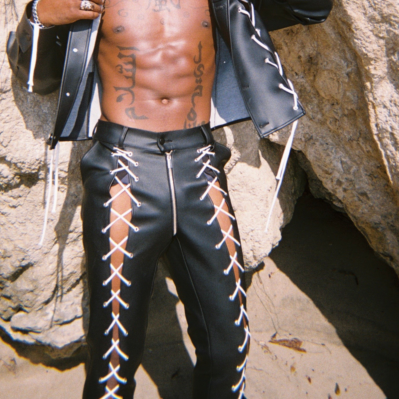 Our Signature Pant made in a Caviar Vegan Leather, with Cutout/Lace detail. Available with or without Leather Strip, under laces, to cover skin.True to Size. Model wears size 34. Ships in 3-5 business Days.